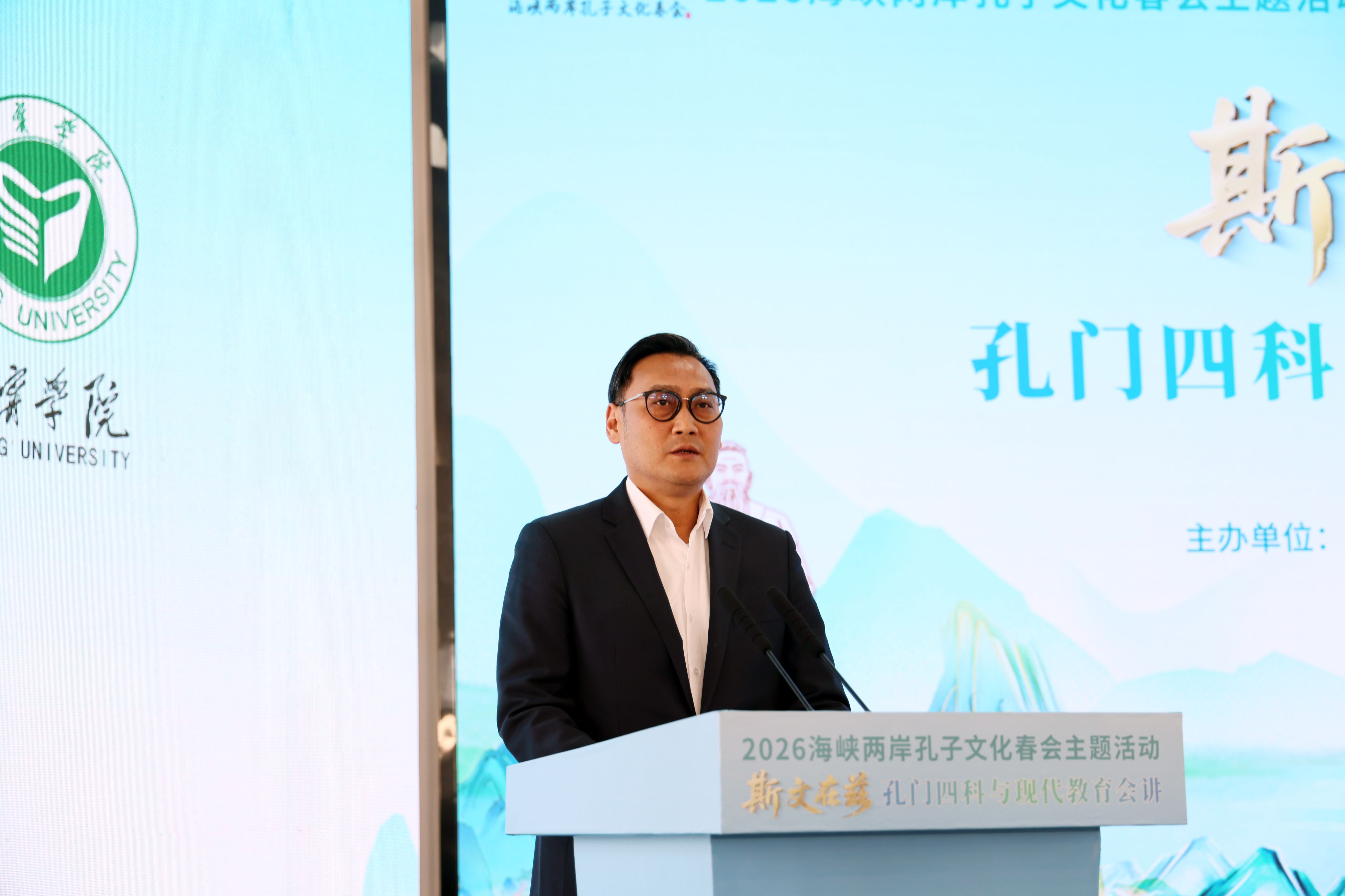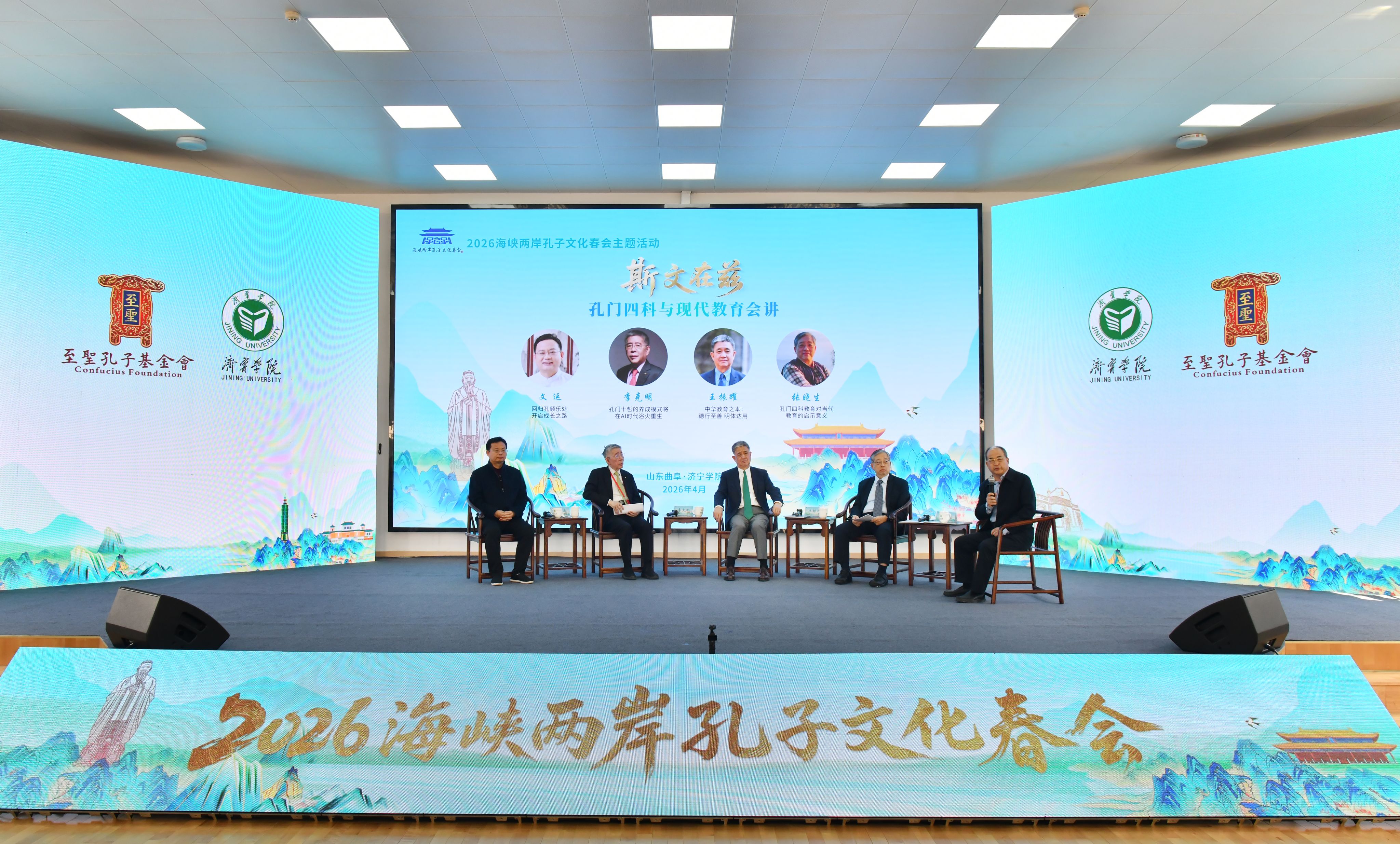 4月1日上午,2026海峡两岸孔子文化春会主题活动——“斯文在兹”孔门四科与现代教育会讲在济宁学院曲阜师范校区举行。孔子第79代嫡长孙、至圣孔子基金会会长、济宁学院名誉校长孔垂长,山东省委常委邓云锋,济宁市委副书记、市长张海波,济宁市委常委、政法委书记白平和,省委台湾工作办公室副主任吴莹,济宁学院党委书记仲红波,校领导赵明、孔繁润、张永强、刘克非及台湾专家、学者出席活动,共享传统文化与现代教育交融的思想盛宴。活动由学校党委副书记丰家雷主持。
