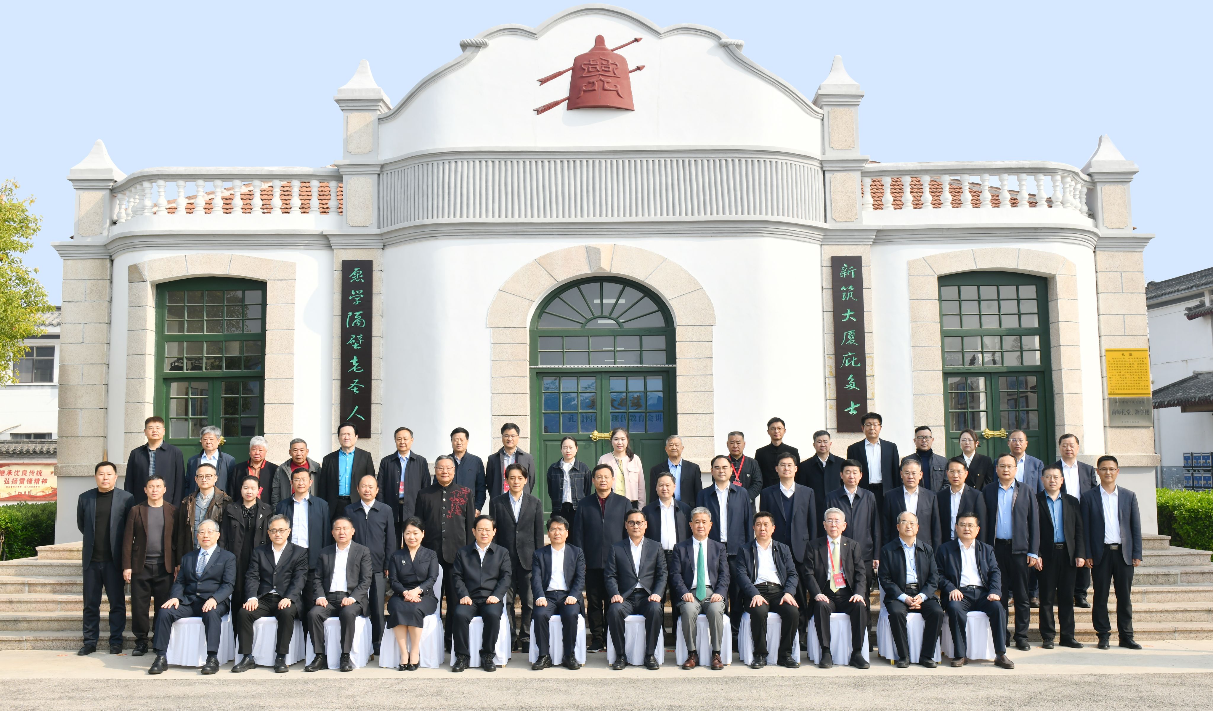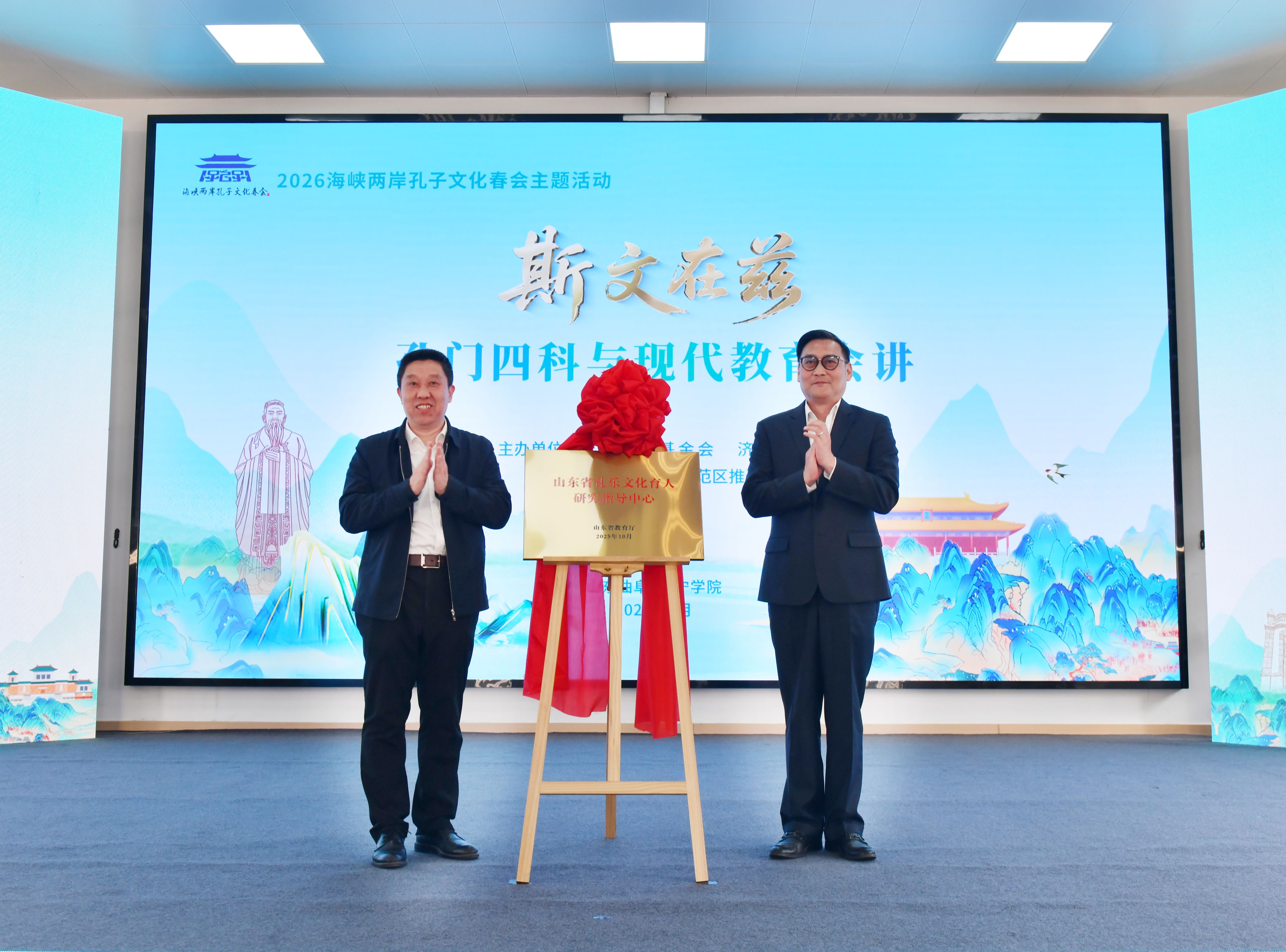 活动中,孔垂长与仲红波为“山东省礼乐文化育人研究指导中心”揭牌,进一步推动中华优秀传统文化融入现代教育,助力礼乐文化育人实践。